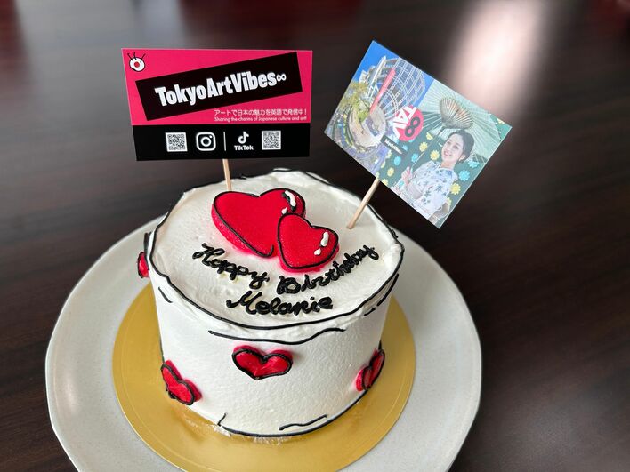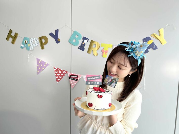 やってきた佐久間アナは「HAPPY BIRTHDAY」の飾り付けを見てびっくり!「去年も祝ってもらったので、あれから1年ですね~」と感慨深げで、Tokyo Art Vibes∞のPR用のカード付きのケーキに「かわいい、ありがとうございます!」と満面の笑みでコメント。