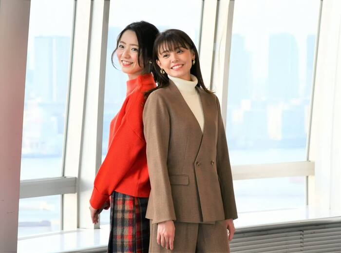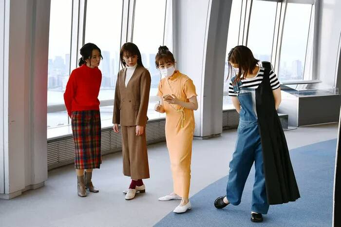 休館日で人気のない球体展望室に、温かみのあるツイードのセットアップを着た宮澤アナと、真っ赤なセーターにチェックの巻きスカート姿の内田アナが登場すると場が一気に華やぐ。
