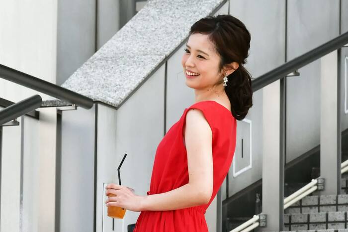 撮影当日は晴天。まさに7月の撮影にふさわしい夏らしい天気の中、ビビッドな 赤のワンピースを着た久慈アナが登場。杉原アナと酒主義久アナと共に、撮影用のアイスティーを片手に颯爽と現場に到着した。