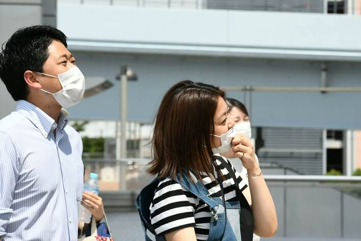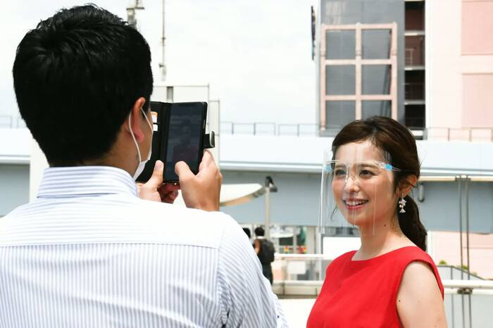 撮影を終えると、フェイスシールド姿のまま酒主アナから記念撮影を求められる場面も。