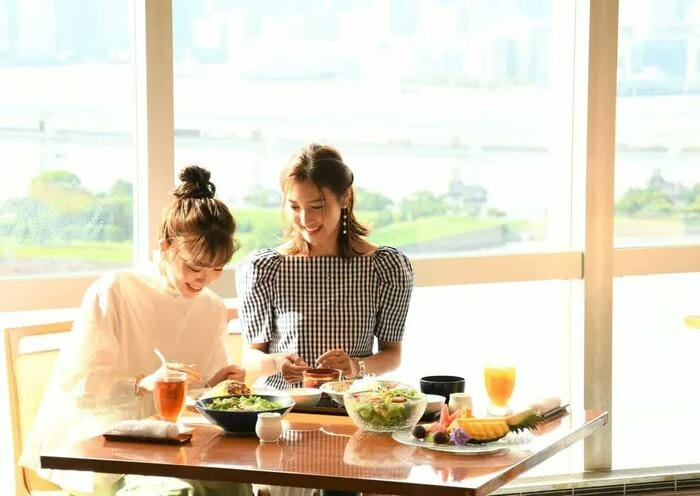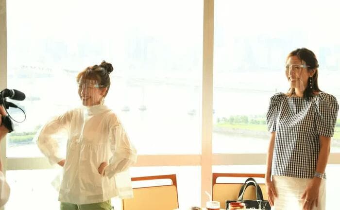 2人は、色とりどりの料理が撮影用に用意された丸テーブルに着席。背後には、窓ガラス越しに東京タワーやレインボーブリッジなどが望める“東京湾のオーシャンビュー”が広がっているという絶好のシチュエーションだ。