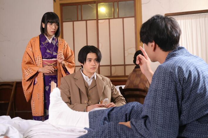 左右馬と鹿乃子は、「くら田」の女将・ヨシ江(磯山さやか)の忘れ物を取りに病院へ。そこでは、カフェー「ローズ」の女給・リリー(村川絵梨)がカフェーの常連客・桐野貫二(黒羽麻璃央)を問い詰めていました。