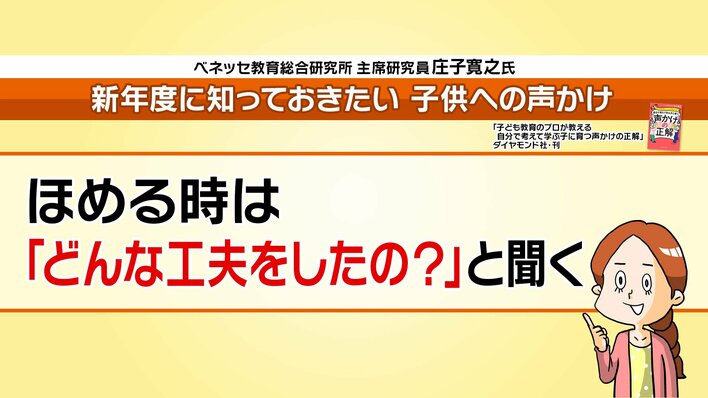 庄子さんは子どもの成果をほめる時に、「どんな工夫をしたの?」という声かけが効果的だとアドバイス。努力の「過程」を聞いてあげることで、子どもは自分が理解されたと感じて、次も頑張ろうと思えるのだそうです。