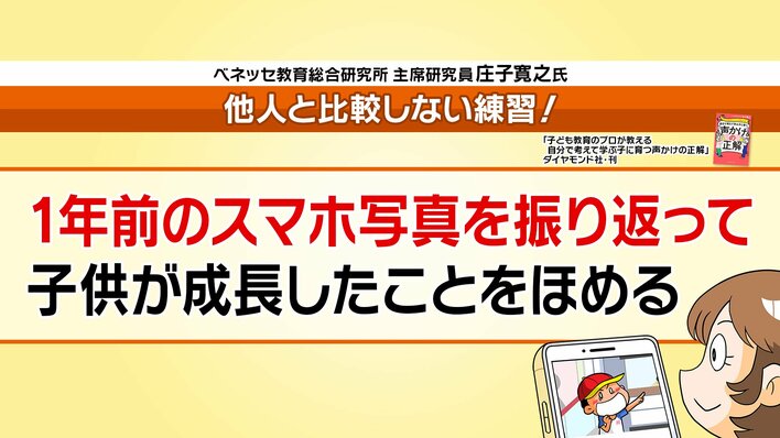 ベネッセ教育総合研究所の主任研究員の庄子寛之さんによると、子どもへの声かけでNGなのは「他者と比べる声かけ」。それを避けるためには、1年前の写真を振り返り、子どもの成長した部分をほめると良いのだそうです。