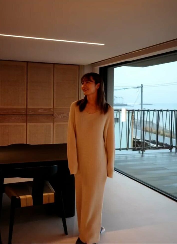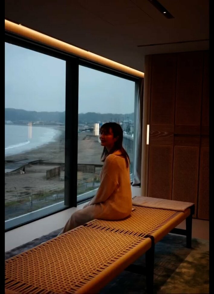 窓際に置かれた椅子に腰掛ける新山さん。大きな窓の外には湘南の海とビーチが広がっているのが見えます。「オーシャンフロントで家具ひとつひとつも洗練されていて、特別感ありすぎる幸せな空間♡」と綴った新山さん。