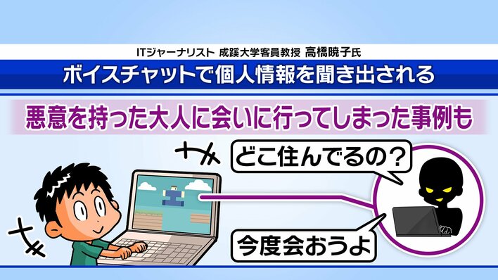 ITジャーナリストの高橋暁子さんによると、オンラインゲームやSNSを介する犯罪の被害は低年齢化が進んでいるそうで、特にゲーム中のボイスチャットなどを通して悪意のある大人から個人情報を聞き出されてしまうケースが多いといいます。