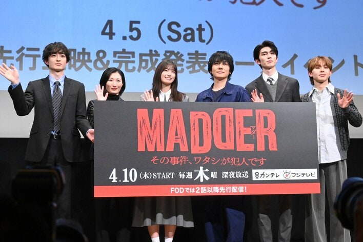 カンテレ×FODドラマ『MADDER(マダー)その事件、ワタシが犯⼈です』の第1話先⾏上映&完成発表トークイベントが4月5日に行われ、主演の五百城茉央(乃⽊坂46)さん、⼭村隆太 (flumpool)さん、武⽥梨奈さん、樋⼝幸平さん、⼭下永玖(ONE N' ONLY)さん、濱正悟さんが登壇しました。