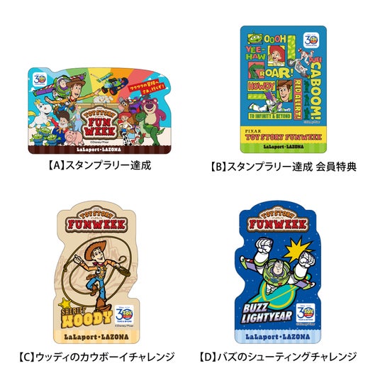 [C]のステッカーを、3.「バズのシューティングチャレンジ」へご参加いただくと[D]のステッカーをプレゼントいたします!
