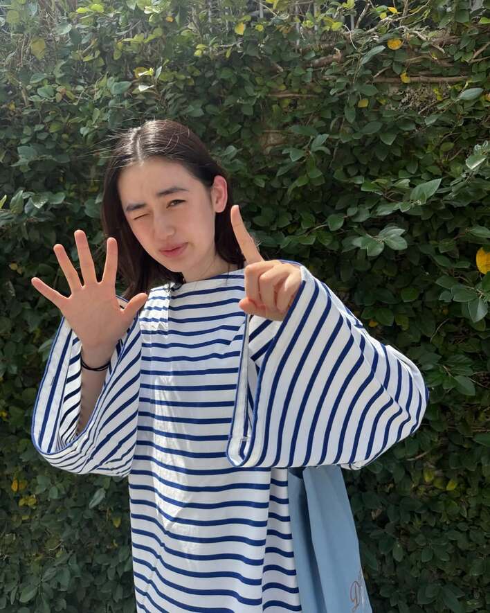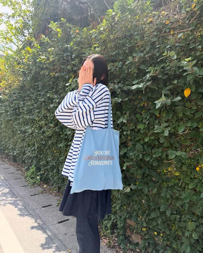 青と白のボーダーシャツに、スカートとパンツを組み合わせたおしゃれなボトムス、水色のトートバッグと、春らしい爽やかなコーディーネットに身を包んだ八木さんは、どこか恥ずかしそうに、両手で顔を覆っています。