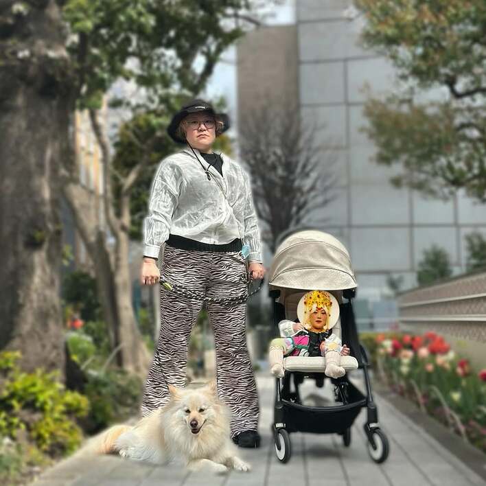 優しい表情をしていて、服装はパンツの柄まで再現されているにも関わらず、まさかの結果に。さらに、愛犬は白い襟付きのシャツを着ていたり、背景には東京スカイツリーのような建物が増えていたりと、ツッコミどころ満載の画像に仕上がっています。