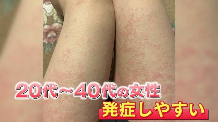 また、こちらの女性の場合は、真っ赤になった手の甲に、いくつもの発疹が…手袋を着けずに通勤した際に発症しました。