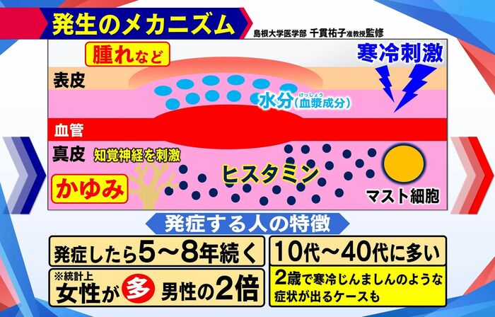 めざまし8「わかるまで解説」ではゲストに島根大学医学部・千貫祐子准教授を迎え、寒冷じんましんのメカニズムについて、解説していただきました。