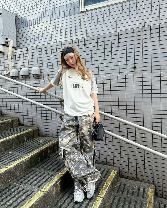 続く全身スタイルでは、足を組んで手すりに寄りかかり、カモフラ柄のカーゴパンツ姿も披露。両サイドの膝下には大きめのポケットが付いていて、デザイン性のあるボトムスを、おしゃれに着こなしています。