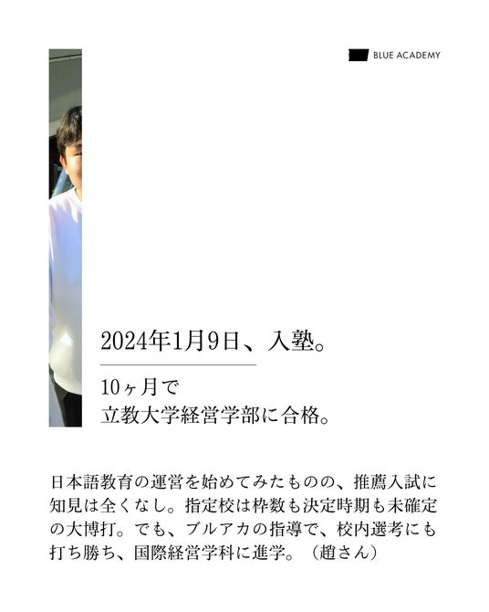 日本語教育の運営を始めてみたものの、推薦入試に知見は全くなし。指定校は枠数も決定時期も未確定の大博打。でも、ブルアカの指導で校内選考にも打ち勝ち、国際経営学科に進学。(趙さん)