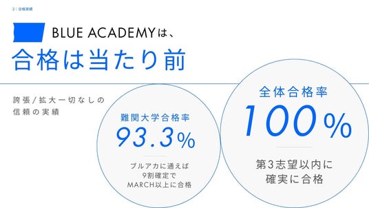 どれだけ良いカリキュラムが存在しても、売れなければ意味がない。だから広告に少し盛った数字を書こう。模擬試験を受けただけの学生も勘定にいれてしまおう。個人から大手まで、学習塾の公表している合格実績の数字が、はたしてどこまで正しいものなのか、消費者は判断する術を持ちません。ブルーアカデミーはカリキュラムに圧倒的な自信とお客様からの支持があることを誇りに思い、広告配信やその他の媒体におけるデータ掲示に一切の脚色や過大表現を掲示しないことをお約束します。