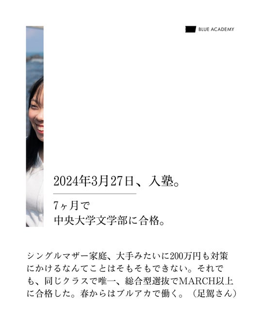 シングルマザー家庭、大手みたいに200万円も対策にかけるなんてことはそもそもできない。それでも、同じクラスで唯一、総合型選抜でMARCH以上に合格した。春からはブルアカで働く。(足駕さん)