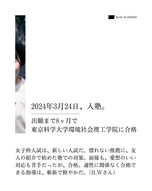 女子枠入試は、新しい入試だ。慣れない推薦に、友人の紹介で始めた塾での対策。面接も、愛想のいい対応も苦手だったが、合格。適性に関係なく合格できる指導は、斬新で鮮やかだ。(R.Wさん)