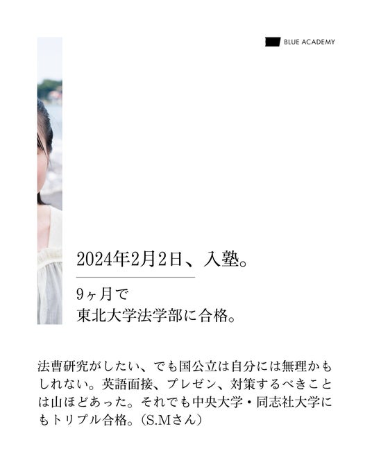 実績づくりの専門塾や、留学ツアーの企画など、「経験の格差」をあえて作ることで、難関大学への合格を果たす手法が近年増え続けています。しかし、鉄壁のカリキュラムと合格実績を持つ私たちからすれば、突飛な飛び道具は必要なく、正しい研究計画の立案と日本語能力の向上で、総合型選抜は堅実に突破できる入試です。実際に、皆さんの先輩方も、短期間での逆転合格を当たり前のように成し遂げています。ブルーアカデミーは“資本”による合格格差をなくし、地方・経済・男女・情報など様々な格差を乗り越え、大学受験という一つのライフイベントを勝ち切れる学生を増やしたいという思いで、創業されました。本キャンペーンを機に、ブルーアカデミーについてより認知していただくことで、我々が、受験生の皆様にとっての「神の一手」となれることを楽しみにしています。