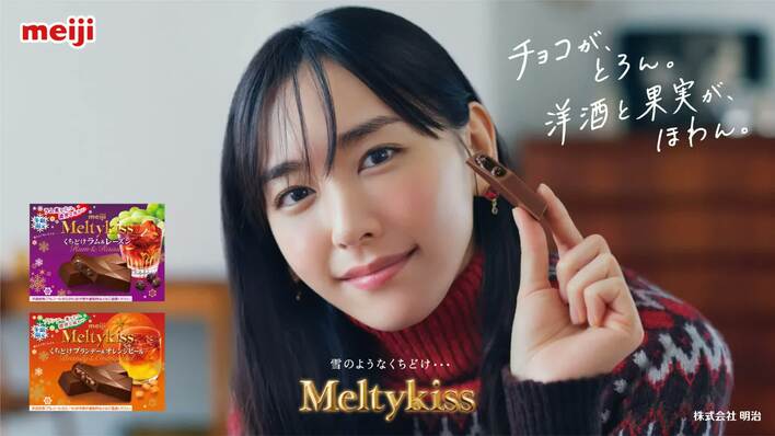 新垣:いよいよ発売を開始しました「メルティーキッス」洋酒チョコレート。みなさんもぜひ「チョコが、とろん。洋酒と果実が、ほわん。」な、贅沢な味わいをお楽しみください。