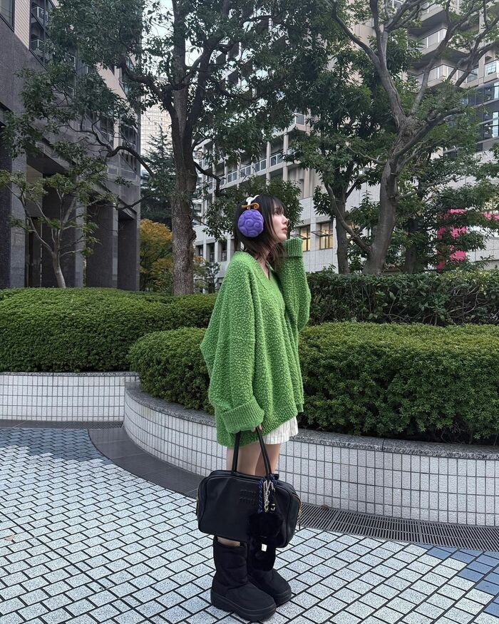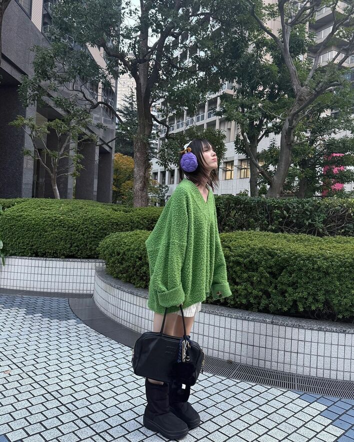「悪魔の実」というコメントとともに、鮮やかなグリーンのニットにミニ丈のボトムス姿で空を見つめる自身の写真を投稿した本田さん。