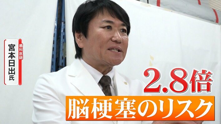 歯周病菌は、全身に回って様々な病気を引き起こすんです。口の中だけの病気ではないんです。菌が体に巡って、非常に悪さします。歯周病になると、脳梗塞のリスクが2.8倍、認知症は1.7倍、糖尿病は2倍ほどリスクが高まります。歯周病の一番怖いのは、自覚症状がないことなんです。