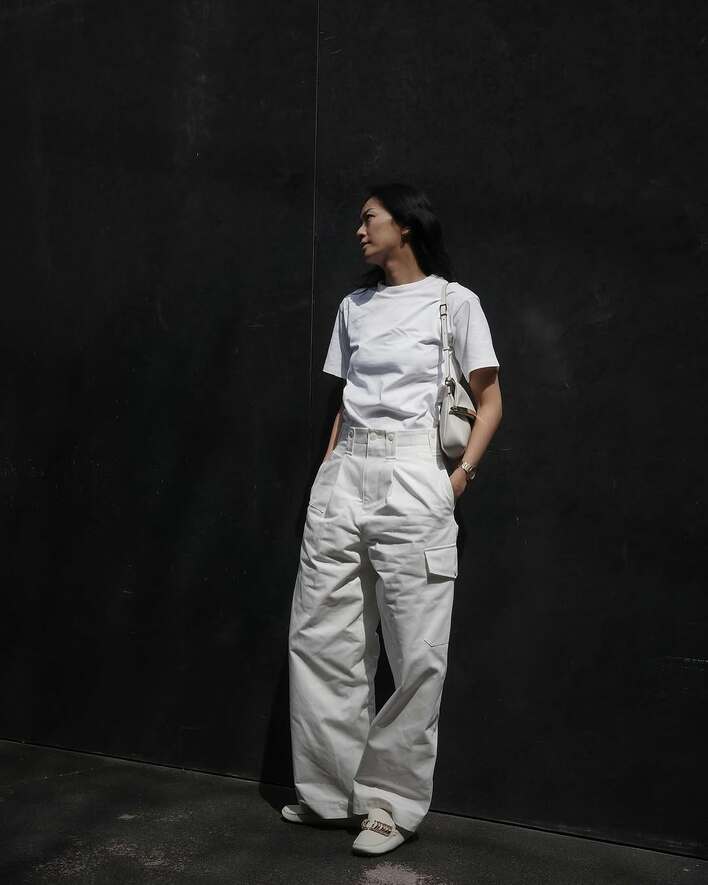 そして、改めて全身のスタイルを見てみると、シンプルな無地の白Tシャツと白パンツというカジュアルながらも、バッグや時計、靴といった小物にはゴールド系で統一感をもたせて、上品にまとまっています。