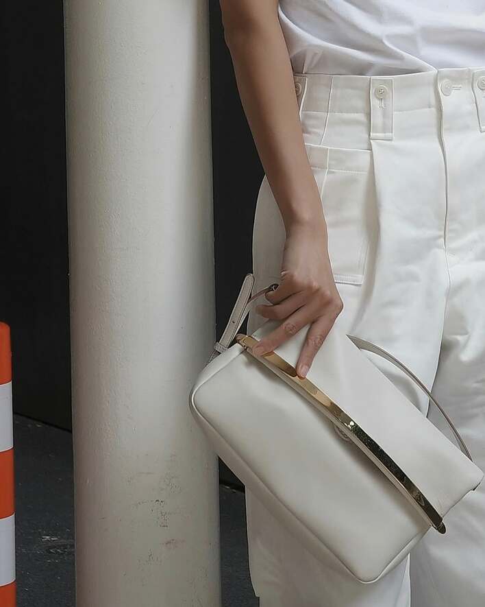 また、白のレザー生地のフラップバッグを手に持つカットも。