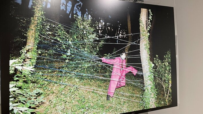 写真展では、緑が広がる森の中で、ビビットなピンクの衣装を着た三宅さんがポーズを決めているショットや・・・