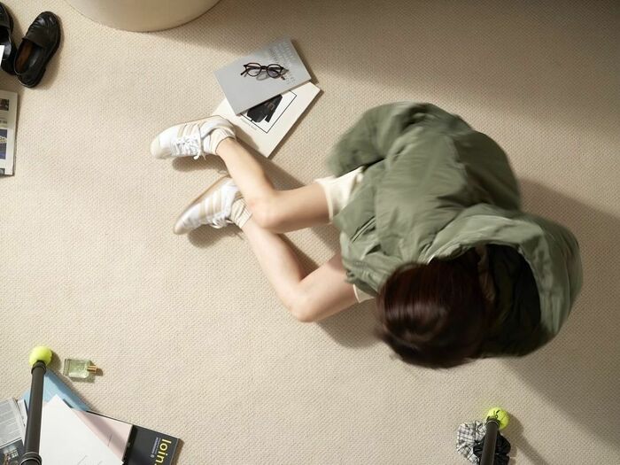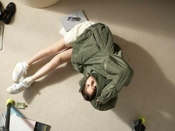 「そろそろね、パディングコート」というコメントとともに、カーキ色のコートに白いショートパンツ姿で寝転びながら、天井のカメラを見つめるショットを公開した井川さん。