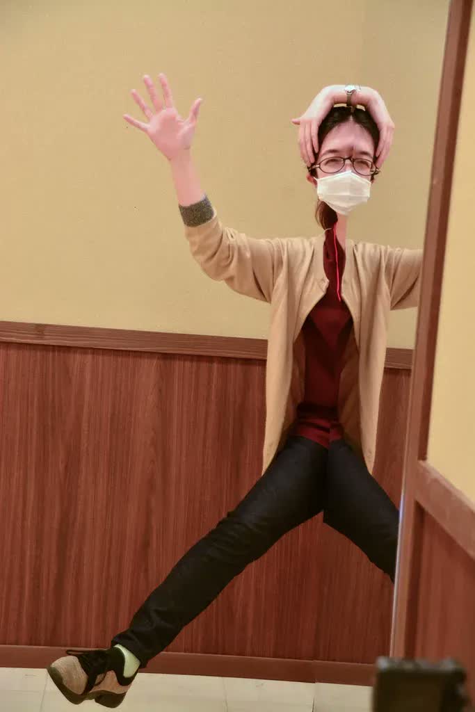 続いては「鏡のダンス」に挑戦。うまく左右対称になるように立ってみるがこれがなかなか難しい。立ってみて初めて気づいたが、ただ中心に立てばいいというものではなく、顔は心持ち外側に出すほうが見映えがいいようだ。手も添えたりして…熱中してしまった。しかし、志村さんの本当のすごさはこのあと判明することに!