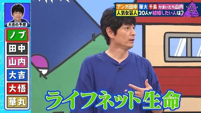 大吉:やっぱもう歳が…。コマーシャルのイメージで考えて。ノブくん「ファブリーズ」で、幸せな家庭。(自分は)「ライフネット生命」…。