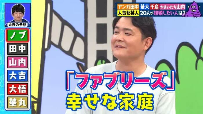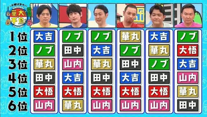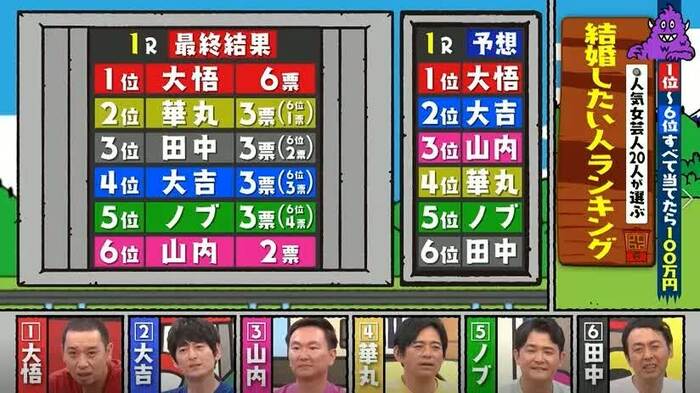 結果は、的中ならず。「山内が最下位だったんだ」(ノブ)、「あれあれ、田中のほうが上だね」(大悟)の声が上がる。