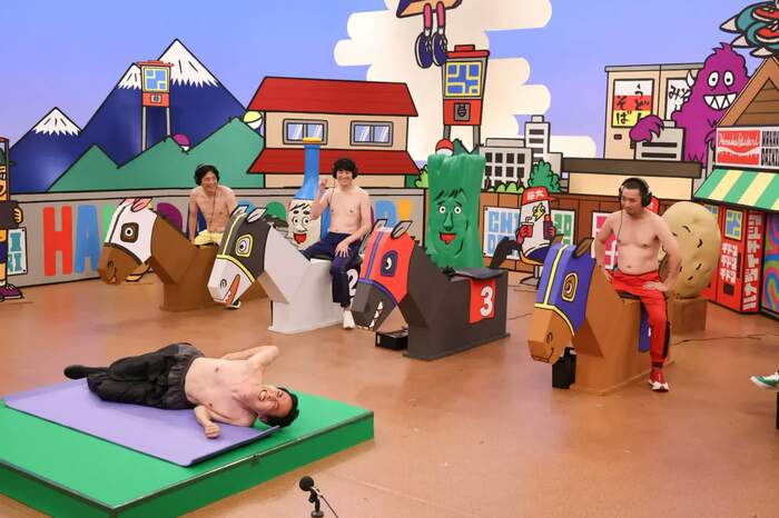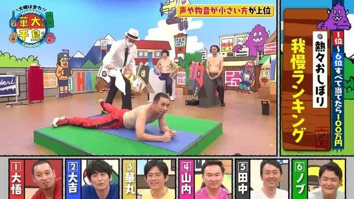 「熱々おしぼり我慢ランキング」は、6人が上半身裸になり、濱家が熱々のおしぼりを背中に投下。そのときに出した音や、リアクションの声の小ささを競った。
