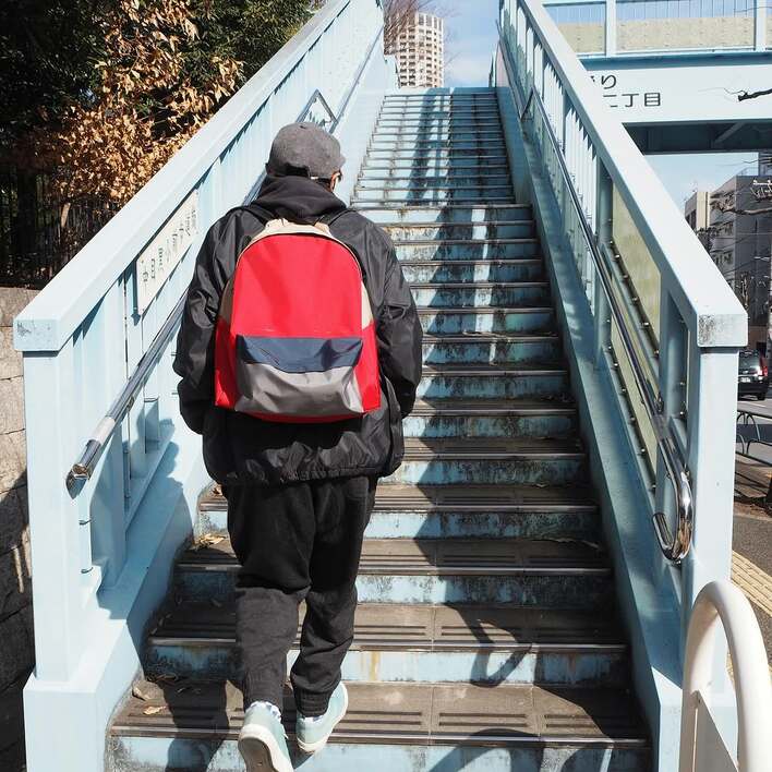 サイズや色など全て好みに作ることができたという『コカドリュック』。投稿では、実際に使用している様子を公開しており、全身黒コーデのコカドさんがリュックを背負って階段を上る様子が。