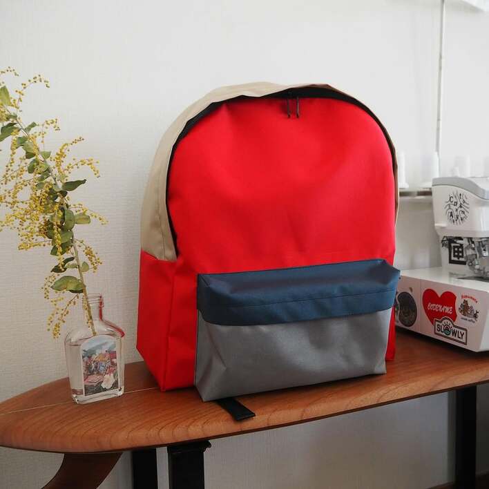 写真を見ると、木製のテーブルに置かれた、鮮やかな赤が目を引くオシャレなリュックが。開口部はベージュカラーと異なる色をピックアップしており、センスが光っていますね!