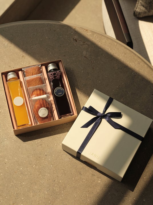 さらに、ジャヌ東京ならではのエッセンスを散りばめた、12種類の個性豊かなオリジナル チョコレート、様々なギフトオケージョンにぴったりなこだわりの焼き菓子やオリジナルジュースのセット、そしてジャヌ東京オリジナルラベルの日本酒など、特別なギフトアイテムをご提案いたします。