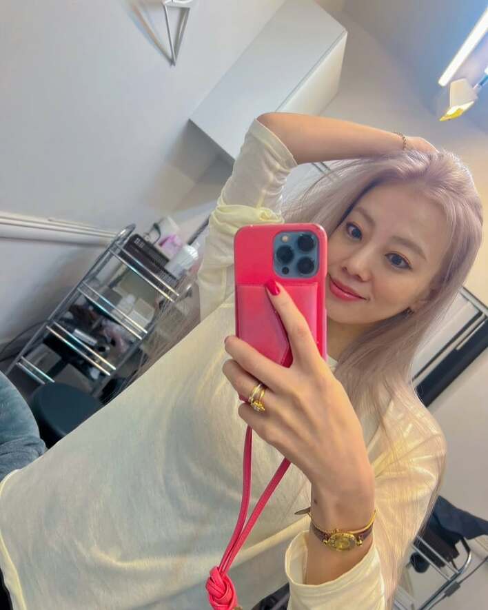 公開されたのは、ハイトーンのブロンドヘアに染まったあびるさんの自撮りショット。