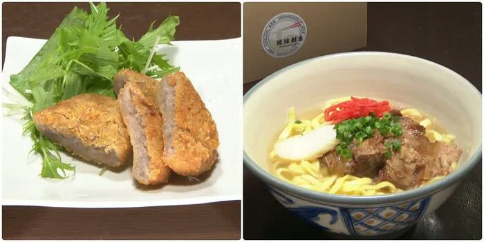 沖縄県の里芋、田芋(ターム)を使ったタームコロッケ(580円)は、ホクホクしてほんのり甘い沖縄の伝統料理。 ほか、ソーキそば(テイクアウトも可能)をいただき、琉球ハイボール(580円)で乾杯。※すべて税込