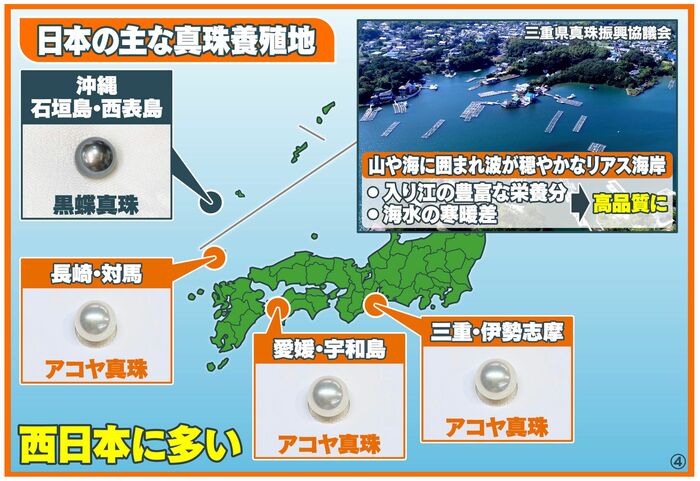 日本の真珠産地は西日本に多く、山や海に囲まれ波が穏やかなリアス海岸で養殖しています。入り江の豊富な栄養分、海水の寒暖差によってキメが整い高品質になるということです。