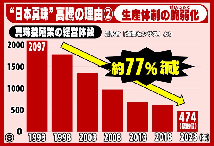さらに、真珠養殖業者は1993年からの30年間で約77%減っており、生産体制のぜい弱化も高騰の一因となっています。