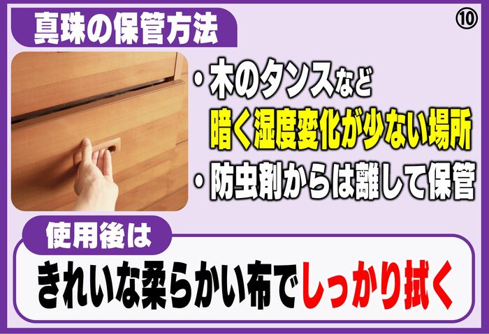 真珠は木のタンスなど暗く湿度変化が少ない場所で、防虫剤からは離して保管するのがポイントだということです。使用後はきれいな柔らかい布でしっかり拭くことが重要です。