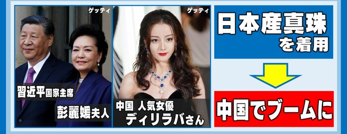 中国では、習近平国家主席の妻・彭麗媛夫人や、人気女優のディリラバさんが日本産の真珠を着用したこともあり、日本産真珠の人気が急上昇。