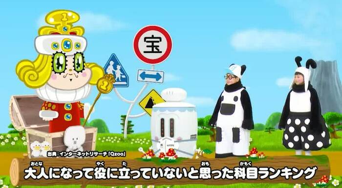 9月6日(日)の放送では、じゃじゃじゃとじゃ~ンがAIさんと歩いていると、宝箱が出現。呪文をかけると、中からランキングが大好きな王様「らんらんキング」が登場。みんなで「大人になって役に立っていないと思った科目ランキング」の1位を予想することに。