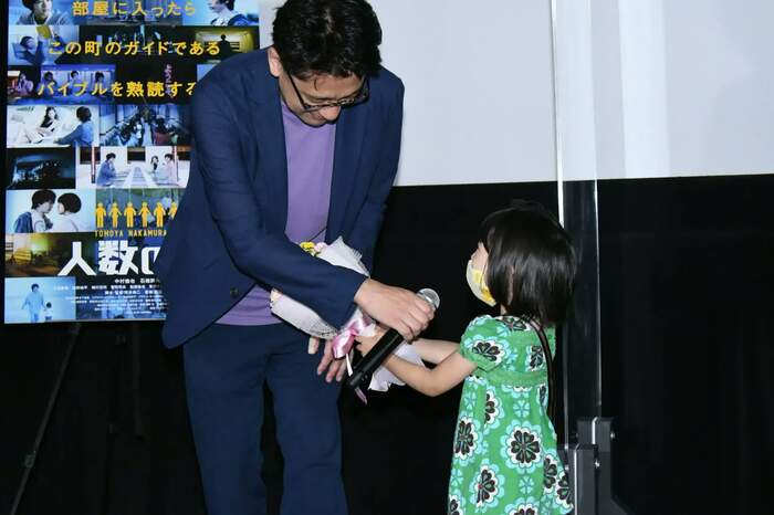 ここでMCが「監督に内緒でサプライズゲストがいらっしゃっています」と紹介すると、子役の吉田萌果が花束を持って登場し、監督に手渡した。