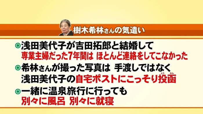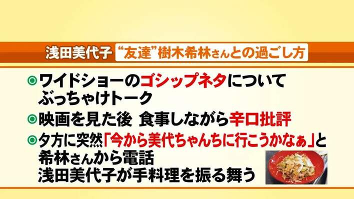 浅田は「樹木さんは整形ネタが好きで、テレビを見ていると電話がかかってきて、『この人、どうだと思う?』と話し合ったりした」「映画は『この役はあの人のほうがいい』と、プロデューサーのような視点で批評していた」など、樹木の思い出を語った。
