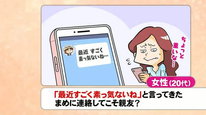 「学生時代からの親友との連絡がコロナで減ったのだが、『素っ気(そっけ)ない』と言われてしまった」という20代女性のお悩みでは、竹山と千秋が「長年の親友なら、連絡を取らなくても大丈夫では?」とアドバイスを。