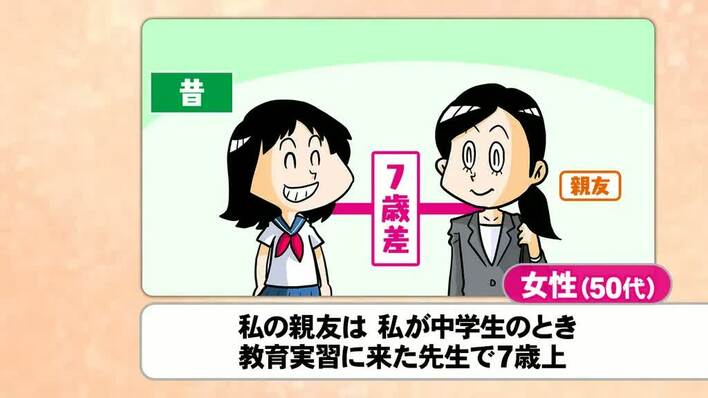 まず紹介されたのは、「中学校に教育実習に来ていた先生と趣味が合い、今でも親友。7歳年上だが、親友に年齢は関係ないと思う」という50代女性のエピソードだ。