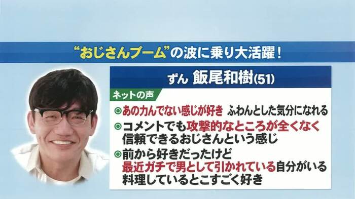 「“非モテ”おじさんブーム」に乗って活躍の場を増やしている、ずん・飯尾和樹の証言が紹介されると、スタジオでは「売れても性格が変わらない」「男気がある」など称賛の声が上がり、番組公式SNSも「飯尾さん、大好き!」「時代が飯尾さんに追いついた!」と盛り上がりを見せた。