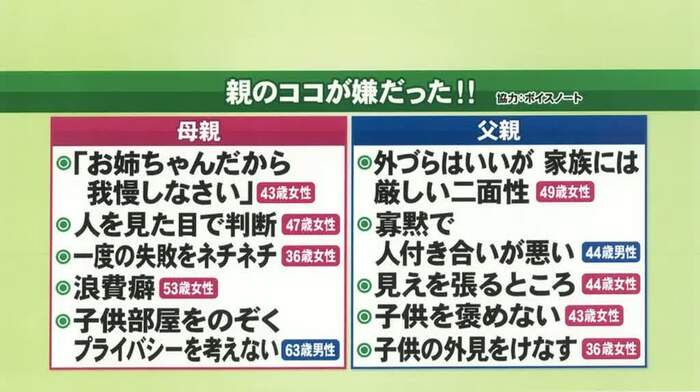 一方、千秋は「親から『勉強しろ』と言われたのが嫌だった経験を踏まえて、娘に『勉強しろ』と言わずにいたら、本当に勉強をしない子に育ってしまった」と自らの反省点を語り、「自分の親のようには絶対にならない、ではなく、子供の性格も考えてどうするかを決めなければ」と、自分の親にわだかまりを抱いたまま子育てをしている人たちにアドバイスを送った。