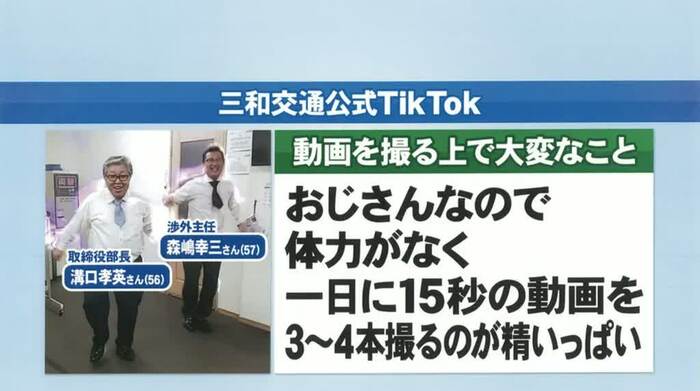 「好かれるおじさんの条件」というテーマで紹介されたのは、タクシー会社「三和交通」の公式TikTokだ。おじさん社員が必死にダンスをする動画が登場すると、千秋と熊田からは「ゆるキャラみたいでかわいい!」という声が。